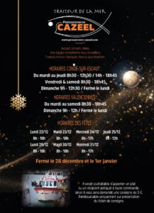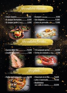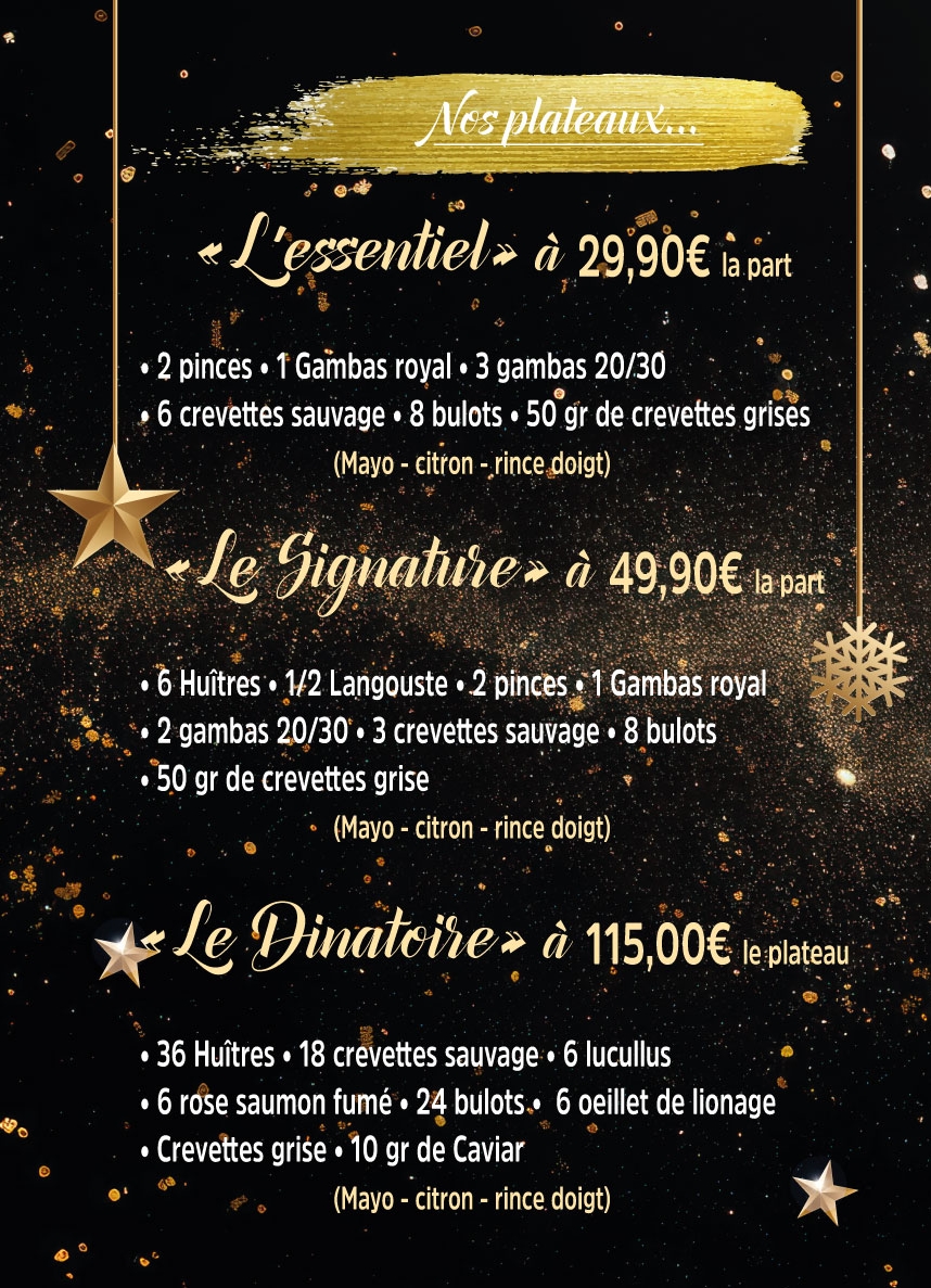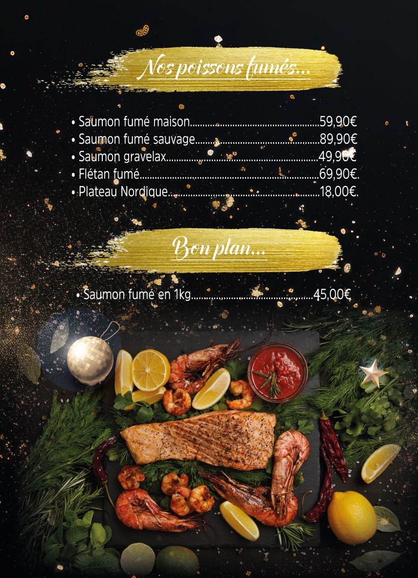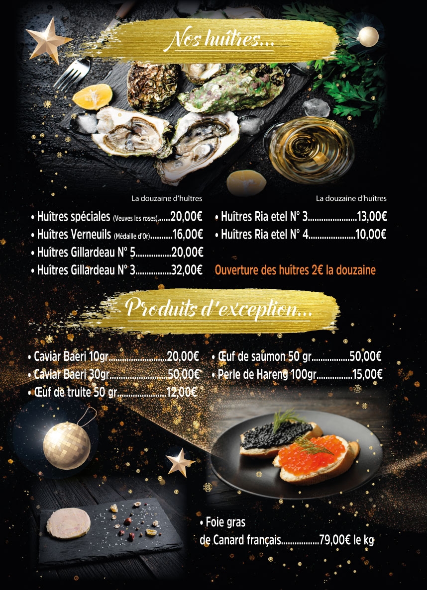 Notre nouvelle carte de Noël 2025 est arrivée ! Vous souhaitez commander des entrées chaudes, froids, des plats, nos différents plateaux de fruits de mer, nos poissons fumées, nos produits d’exception (caviar, œufs, foie gras)